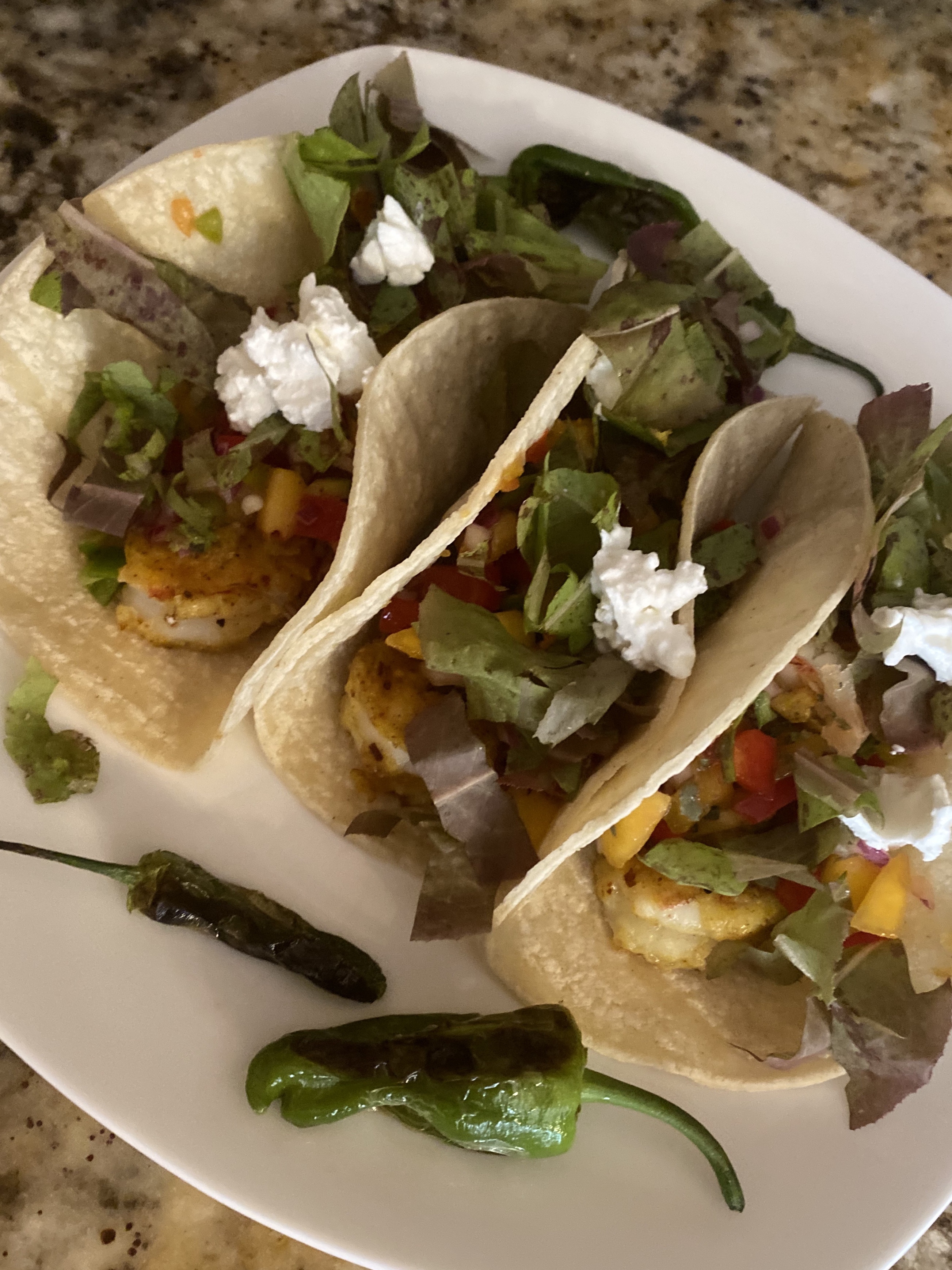 - To assemble: On each taco shell, 3 shrimp, peach salsa, sprinkle a little shredded lettuce and top with the goat cheese. Garnish with cilantro. Serve with fresh lime wedges to squeeze over the top.
