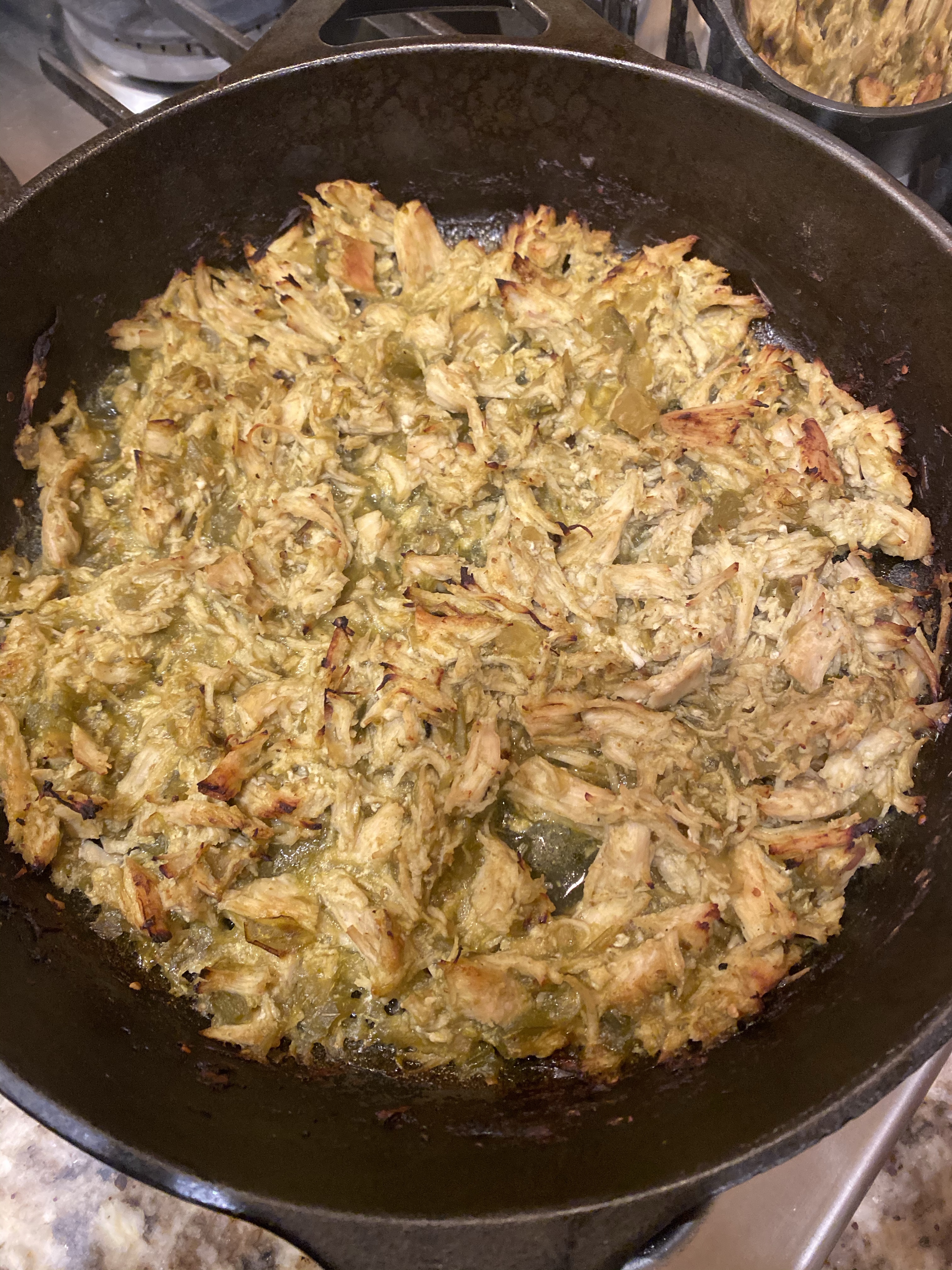 Cook the chicken in the salsa verde sauce on the stovetop covered until cooked through. Shred it and broil it in the oven for a 3 minutes, toss and put back in for 3 more minutes. Roughly.