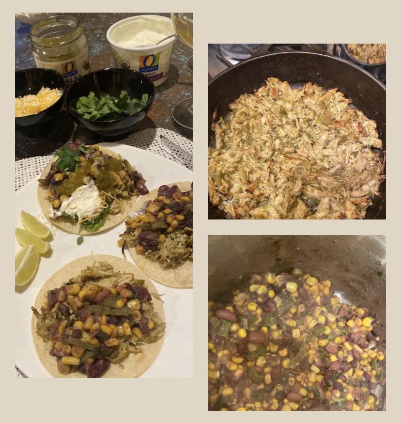 Chicken Verde Tacos with Tri-bean medley, corn, cilantro, green onion,shishito peppers, and cumin with lime!