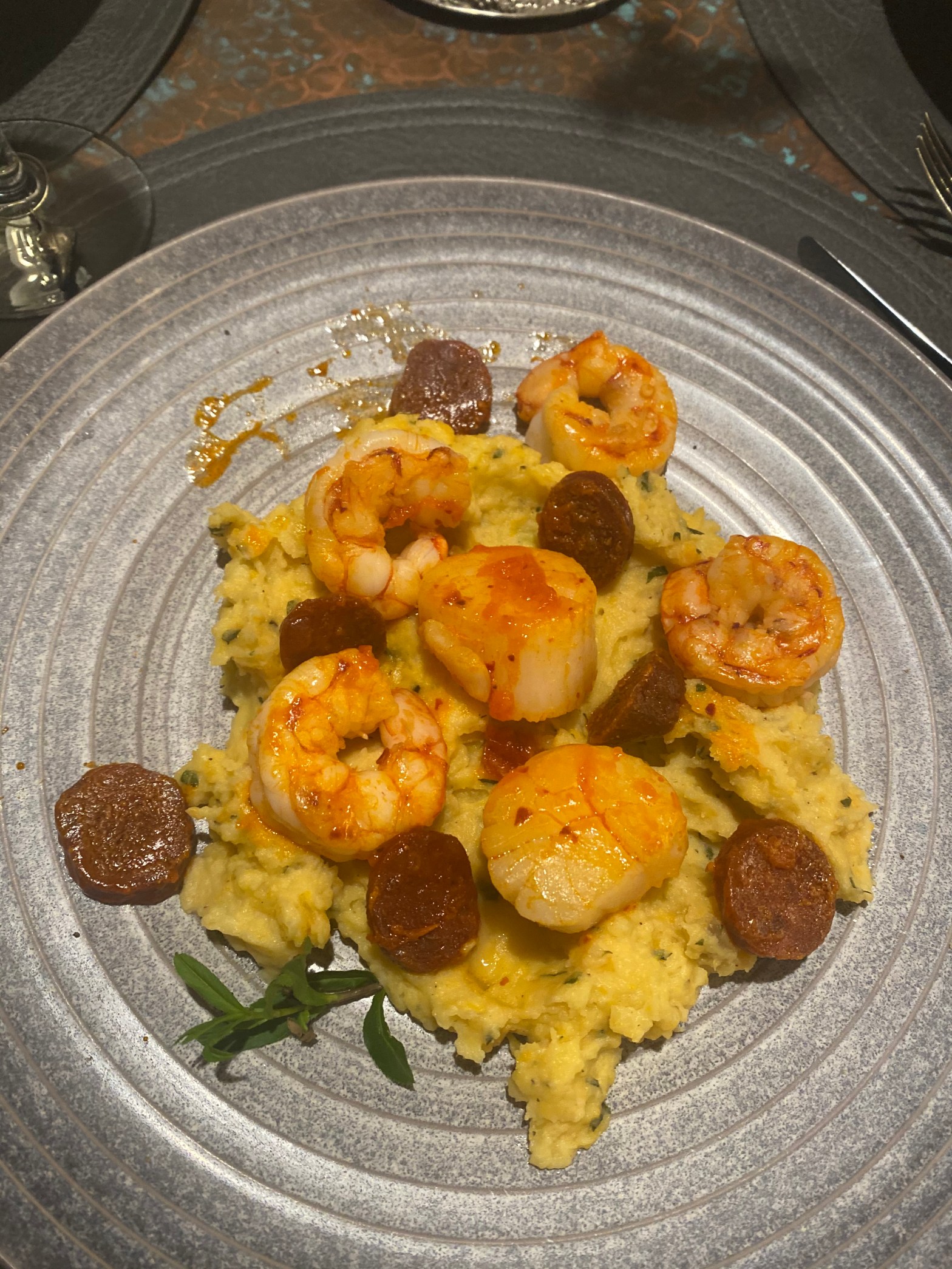 Tonight’s special was a Seafood Medley with Spicy Spanish chorizo over a bed of tarragon mashed potato blend. So good!