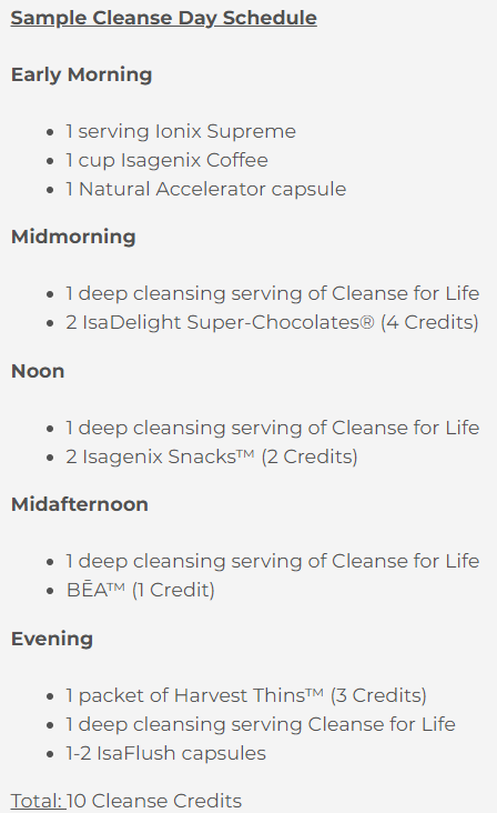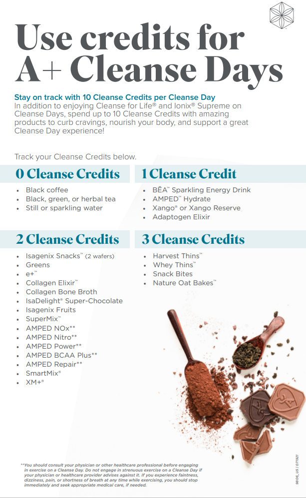 Every Cleanse Day starts with essential products to help support your success during the day, like Cleanse for Life, Ionix Supreme, Natural Accelerator, and IsaFlush. You will also choose from Cleanse Day-approved snacks to help you manage cravings and provide steady energy while keeping calories very low.