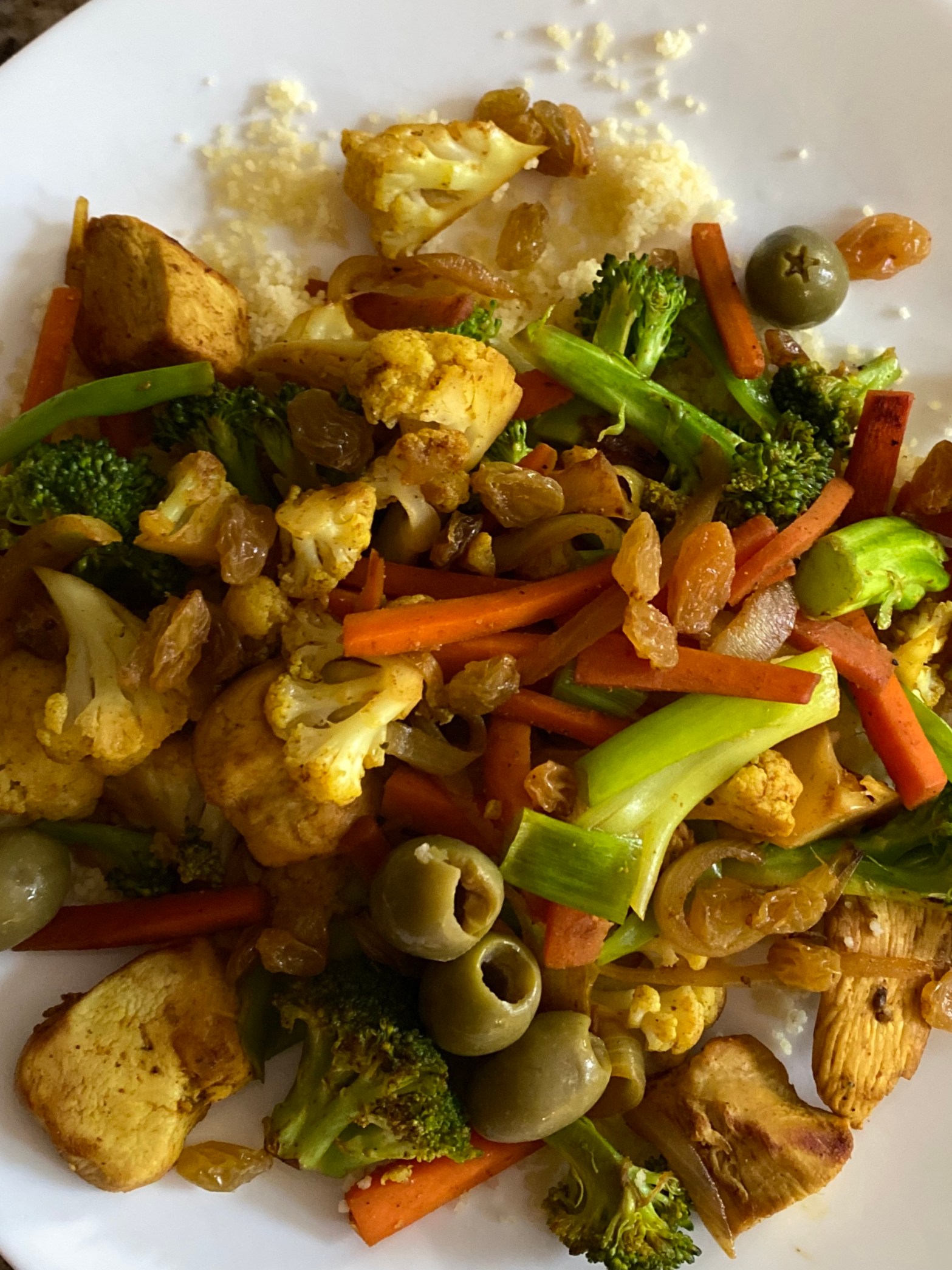 This chicken stir-fry recipe brings the flavors of Morocco to intersect with hints of sweetness from the golden raisins and the tang of green olives. Enjoy! Ingredients: (2 servings) 1 8-oz chicken breast diced in bite size pieces 1 tablespoon coconut oil (can substitute with butter) 1 large carrot thinly sliced ½ sweet onion thinlyContinue reading “Moroccan-Spiced Chicken Stir-Fry over Couscous”